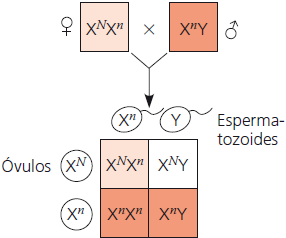 Nas imagens abaixo, o daltonismo é utilizado como exemplo. O N sobrescrito representa o alelo dominante para visão normal carregado pelo cromossomo X, e o n sobrescrito representa o alelo recessivo, que possui uma mutação que causa o daltonismo. Os quadrados brancos indicam os indivíduos não afetados, os quadrados em cor de laranja claro indicam os carreadores, e os em cor de laranja escuro, os indivíduos daltônicos.